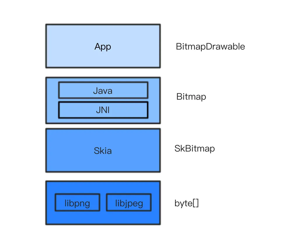 - Bitmap 是对 SkBitmap 的包装。具体说来, Bitmap 的具体实现包括 Java 层和 JNI 层,JNI 层依赖 Skia。