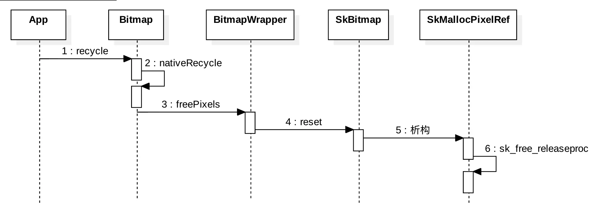 fPixelRef 原本指向一个 SkMallocPixelRef 对象。将 fPixelRef 置空后,该对象引用数变成0时,~SkMallocPixelRef() 析构方法被调用,并触发 sk_free_releaseproc() 方法执行,回收内存。