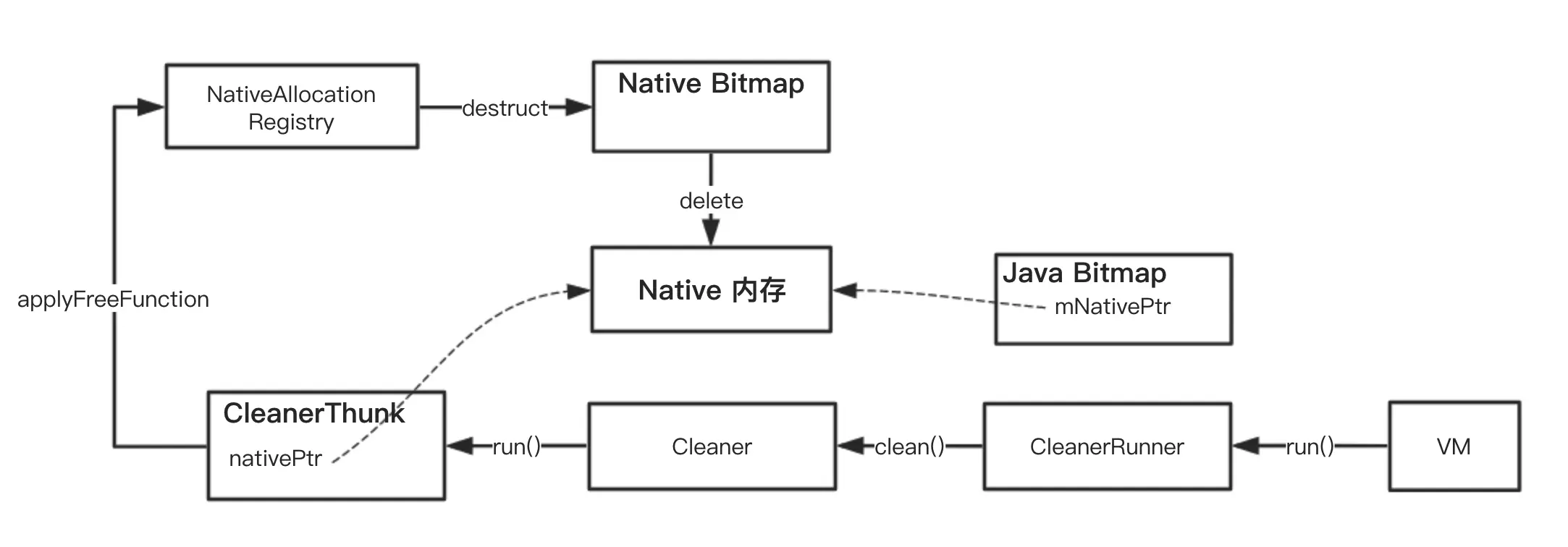 当 Java 层 Bitmap 对象不可达后关联的 native 内存会由 nativeGetNativeFinalizer() 指定的方法来回收,流程如下: