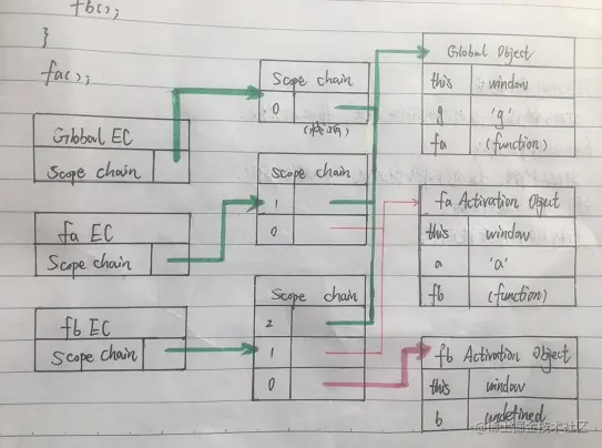 - 接着,当预编译fb函数时,首先按照规则1拷贝了其父级的作用域链,即fa函数的AO作用域链以及全局环境下的GO作用域链。最后将自己生成的AO作用域链压入fb函数作用域链的栈顶。(此时,GO引用数为3,fa的AO引用数为2,fb的AO引用数为1)