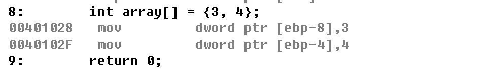 基本可以看出来汇编代码的意义:将 3 存在内存地址为 ebp-8 的位置上,将 4 存在内存地址为 ebp-4 的位置上。