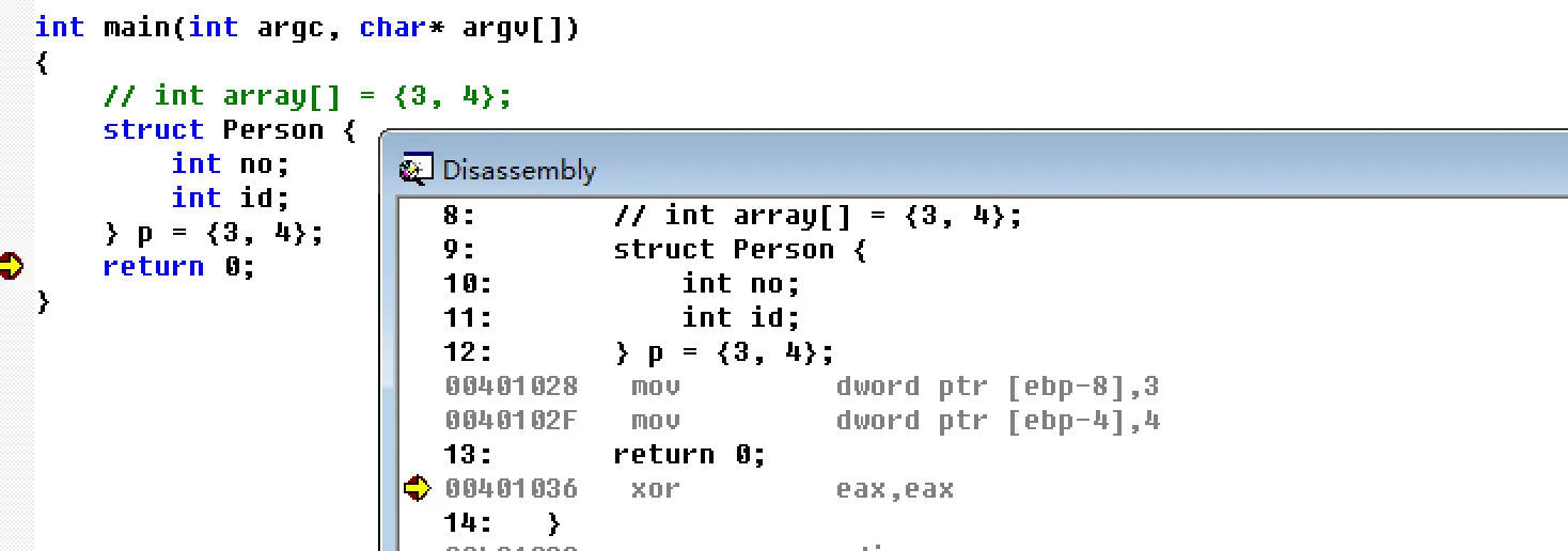 可以发现,对应的汇编代码一摸一样,所以通过汇编无法得到对应的高级语言代码,因为对于汇编来讲,上面的两段代码都是开辟8个字节的内存空间,分别存3和4。通过汇编语言看逆向推导,是无法知道高级语言是创建了数组还是结构体的。这就是为什么汇编语言无法还原成高级语言。