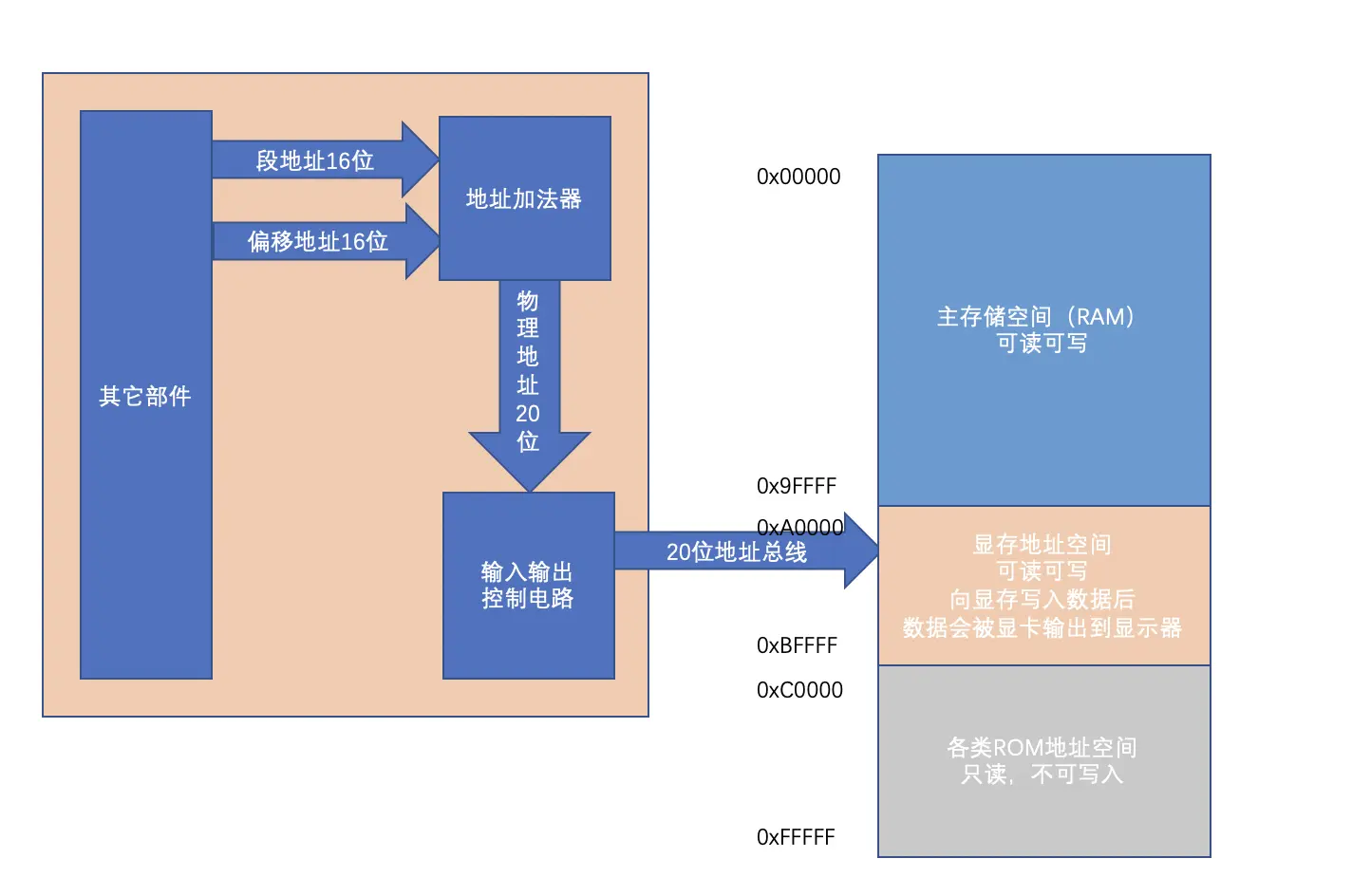 - 地址加法器将两个16位地址合成一个20位的物理地址。