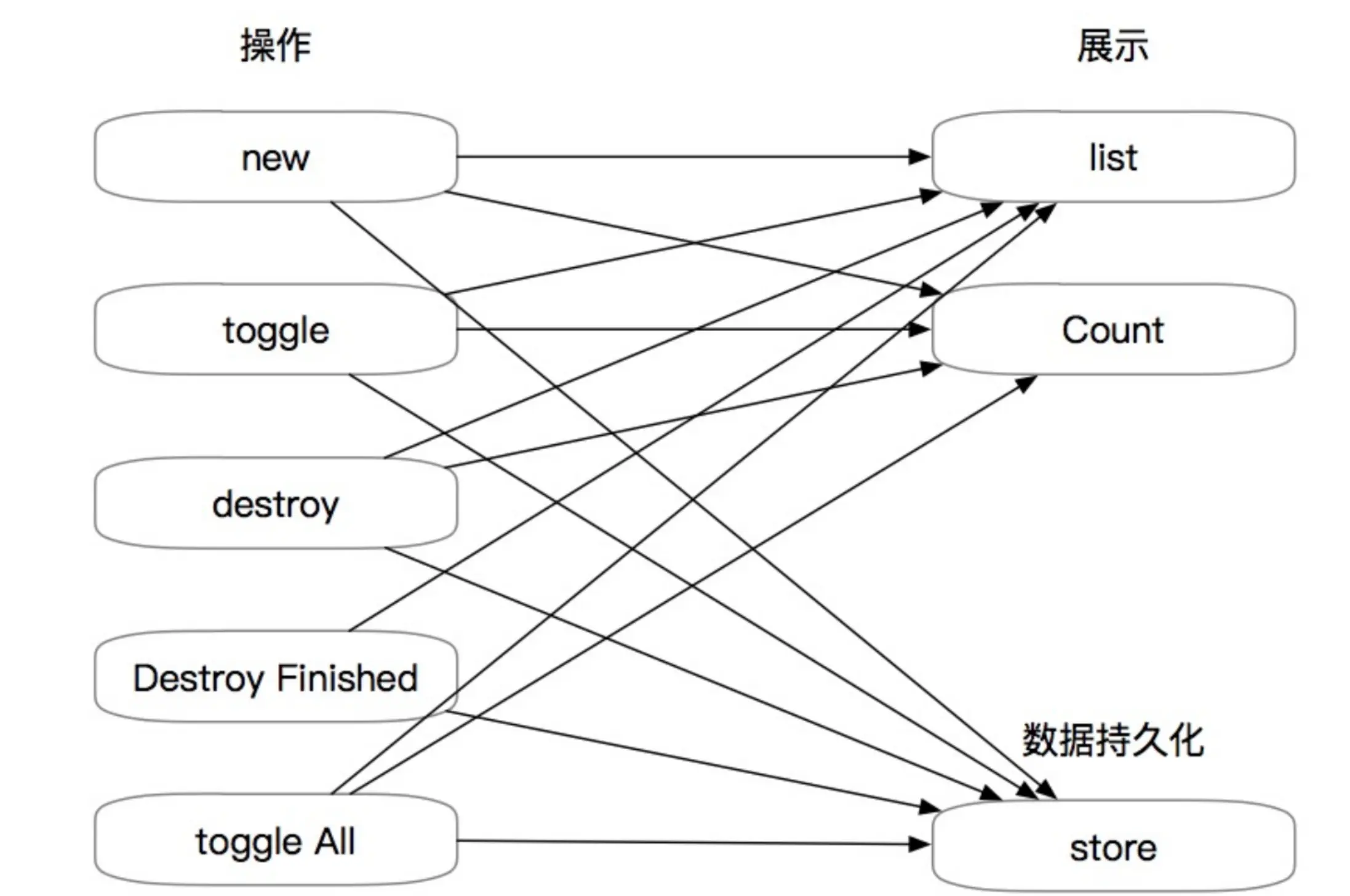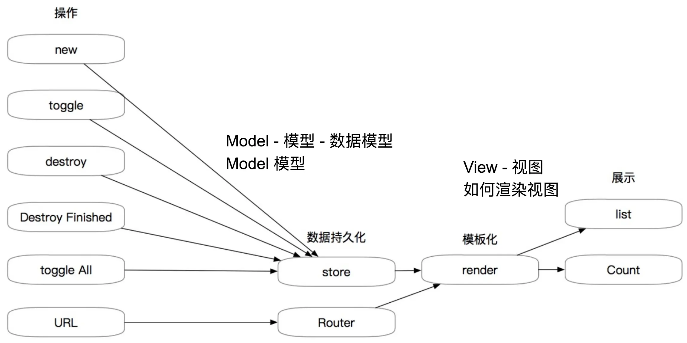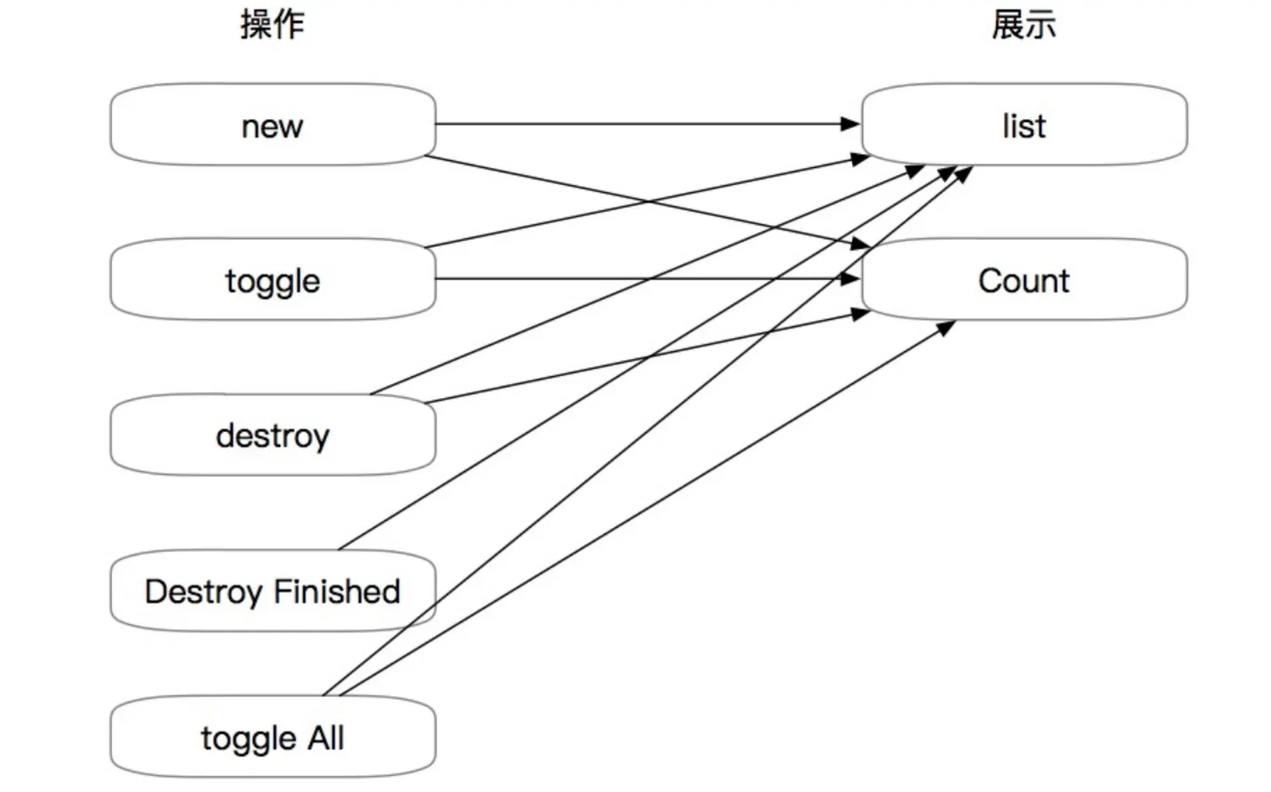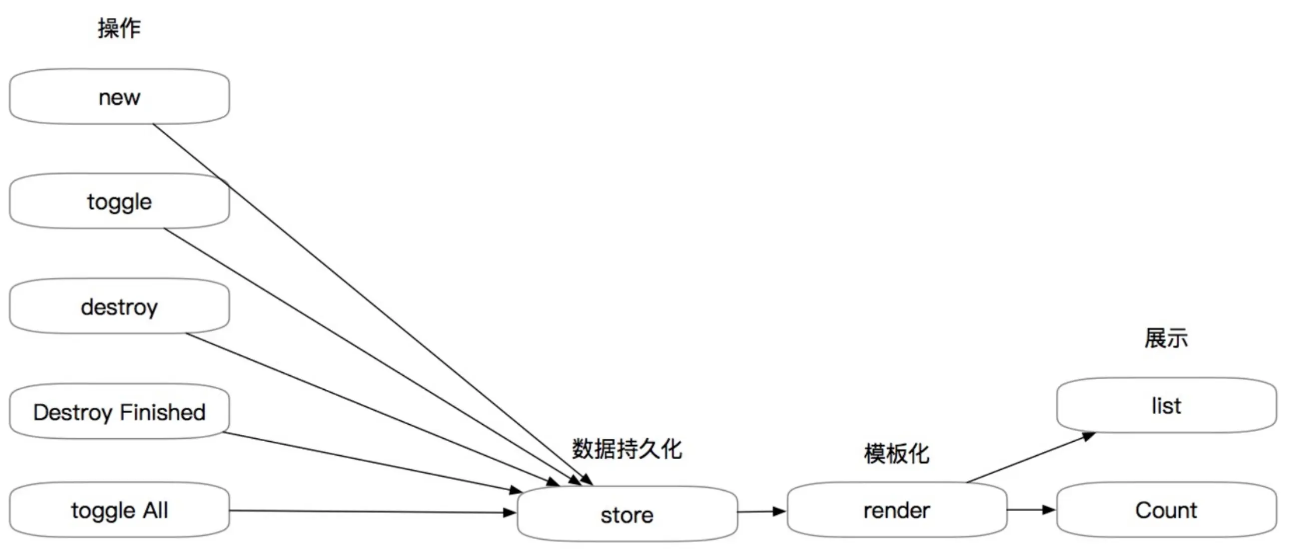 只使用jQuery渲染视图层list列表和count数字统计,并实现new、toggle、destroy、destroy finished、toggle all等交互操作,dom操作就比较频繁,如图所示: