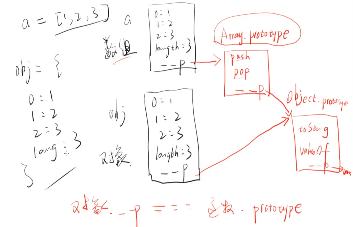 因为它们的公用属性是不一样的。a.__proto__ 指向的是数组的公用属性 Array.prototype,这个公用属性有 push、pop 等函数,Array.__proto__ 指向的是 Object.prototype。而 obj.__proto__ 并没有指向 Array.prototype,它是 Object 构造出来的,直接指向 Object.prototype。也就是说这两个对象本身的内存是没有区别的,它的区别在于原型是不一样的。数组之所以为数组,是因为它拥有数组的特点,对象之所以为对象,是因为它没有数组的特点。所以数组和对象本质的区别就是它们的 __proto__ 有没有指向 Array.prototype。