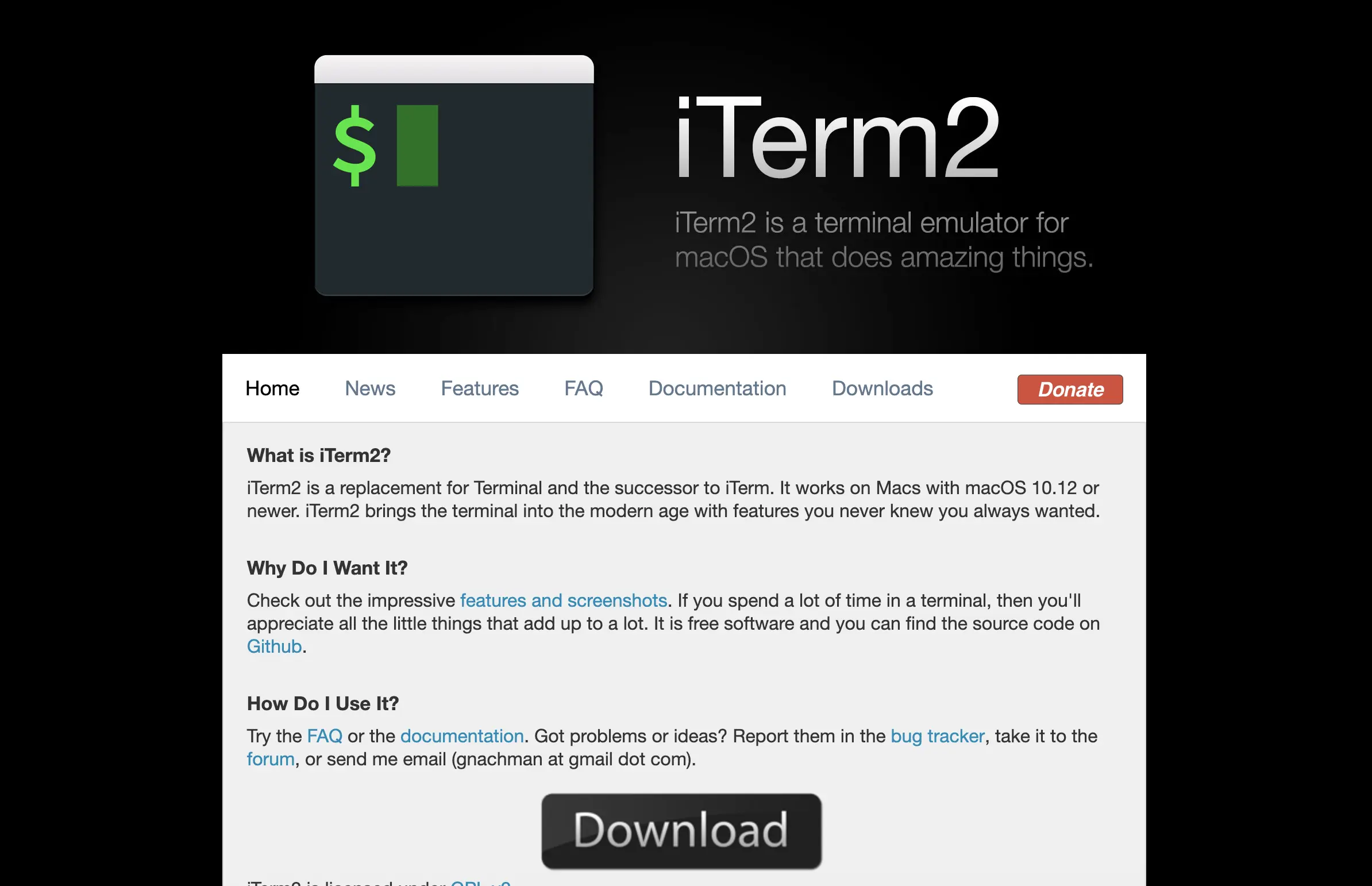直接去官网,然后点那个大大的下载按钮。下载完成后,像任何其他应用一样打开并安装它。(如果你感兴趣,你可以点这里查看 iTerm3 的下载链接。)