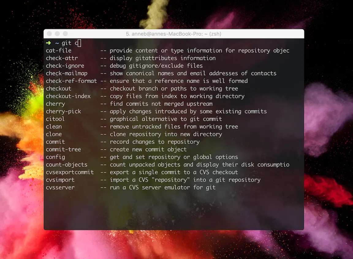 默认的 shell 是 bash,如果你想继续使用它也完全可以。但是 Zsh 更加可定制,并有着运行更快的声誉。Zsh 做的一件很酷的事情是自动补全。任何时候,你可以敲 git c 再按 tab 键,然后你就会看到一个提供了自动补全建议的帮助窗口。
