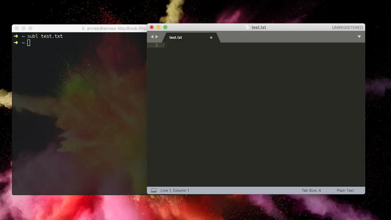 这会打开 Sublime 并创建一个全新的、名为 test.txt 的文本文件。