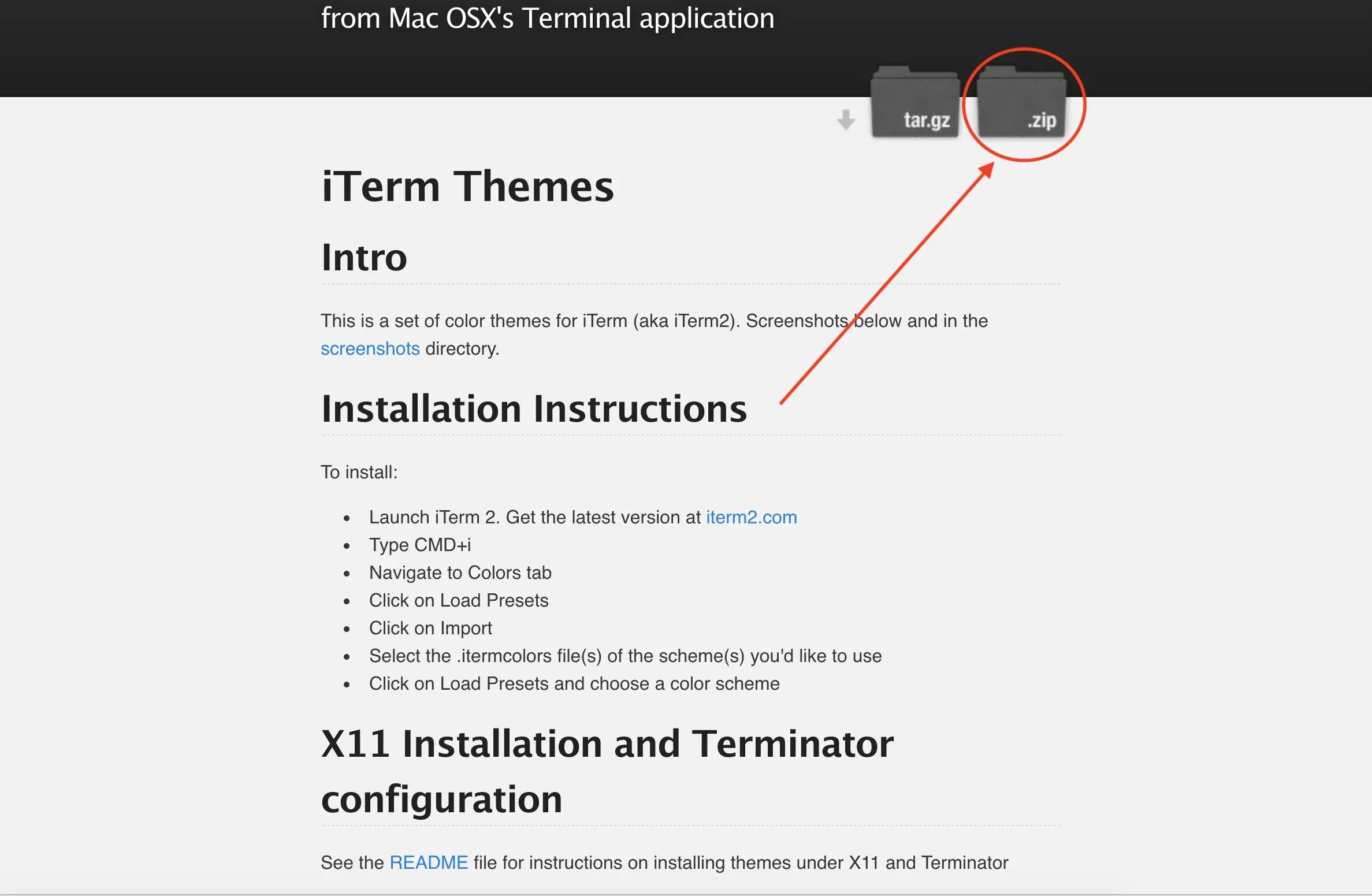 如果你想安装一个自定义的 iTerm 主题,直接去 这个 GitHub 仓库 然后点击顶部的图标来下载主题。(我直接下载了 zip 文件,下载完成后,双击解压缩)