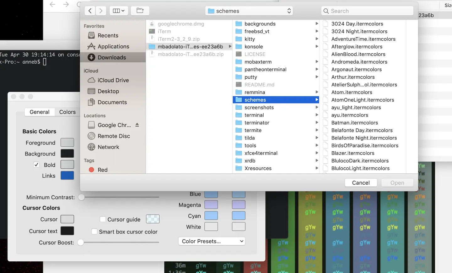 下一步,去“偏好设置“,点击 ”Colors“ 标签然后在 ”Color Presets“ 下拉菜单中点击 ”Import“。你可以在这选择想要的颜色主题。它会弹出一个访达窗口。如果你想用 Atom 主题,可以在你下载了的那个文件夹中,去 schemes 文件夹里,然后选择 Atom.itermcolors,然后点”打开“。