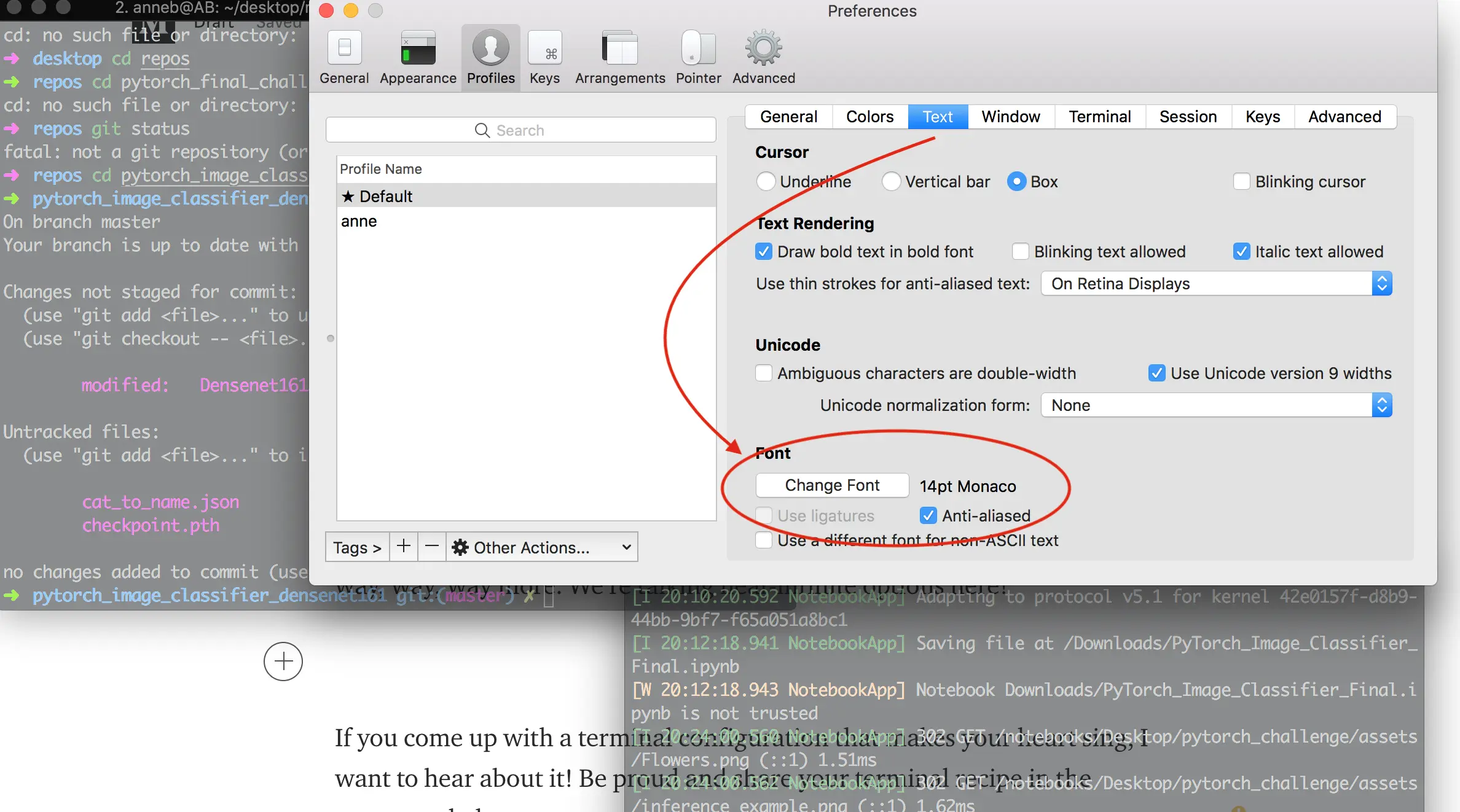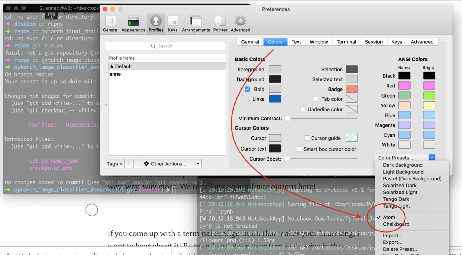打开 iTerm,在菜单栏中 iTerm 一栏中点击 “偏好设置”。这会弹出一个有很多选项的窗口。在“Colors”标签中,你可以选择你喜欢的颜色,或者你也可以选择 “Color Presets” 下拉菜单中的选项。你可以选择一个暗色主题,或者选一些简单的颜色。在“Text”标签下修改字体及字号也很简单。