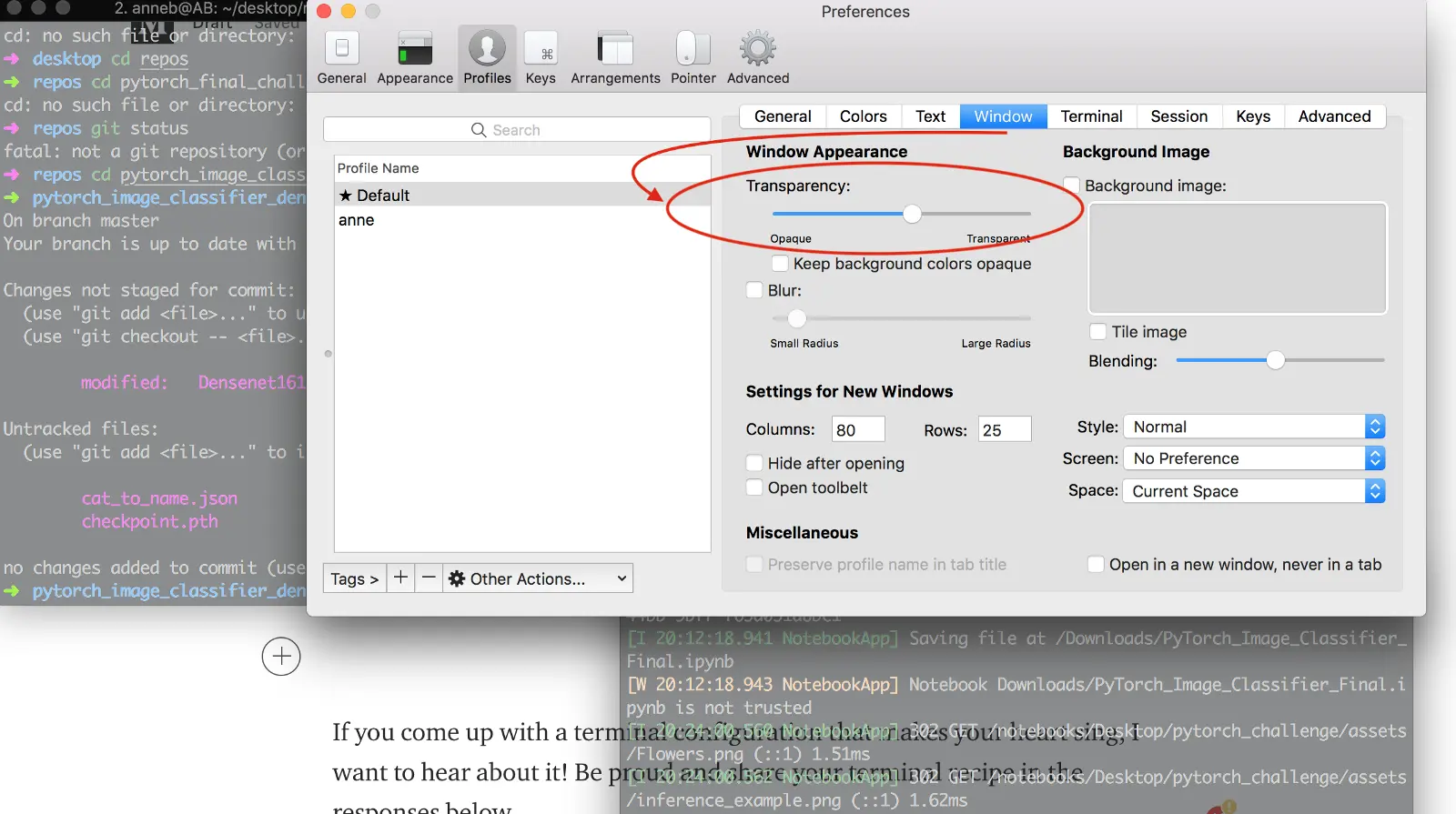调整窗口透明度也很简单。有时你可能需要留意被覆盖在终端窗口下面的进程。作为一个编程新手,你可能需要确保你的工作严格按照教程在走。那这个功能会对你有所帮助!