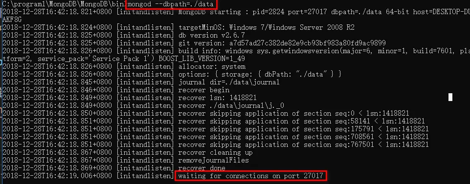 waiting for connections on port 27017就表示启动成功,已经在27017端口上监听了客户端的请求 - 注意: