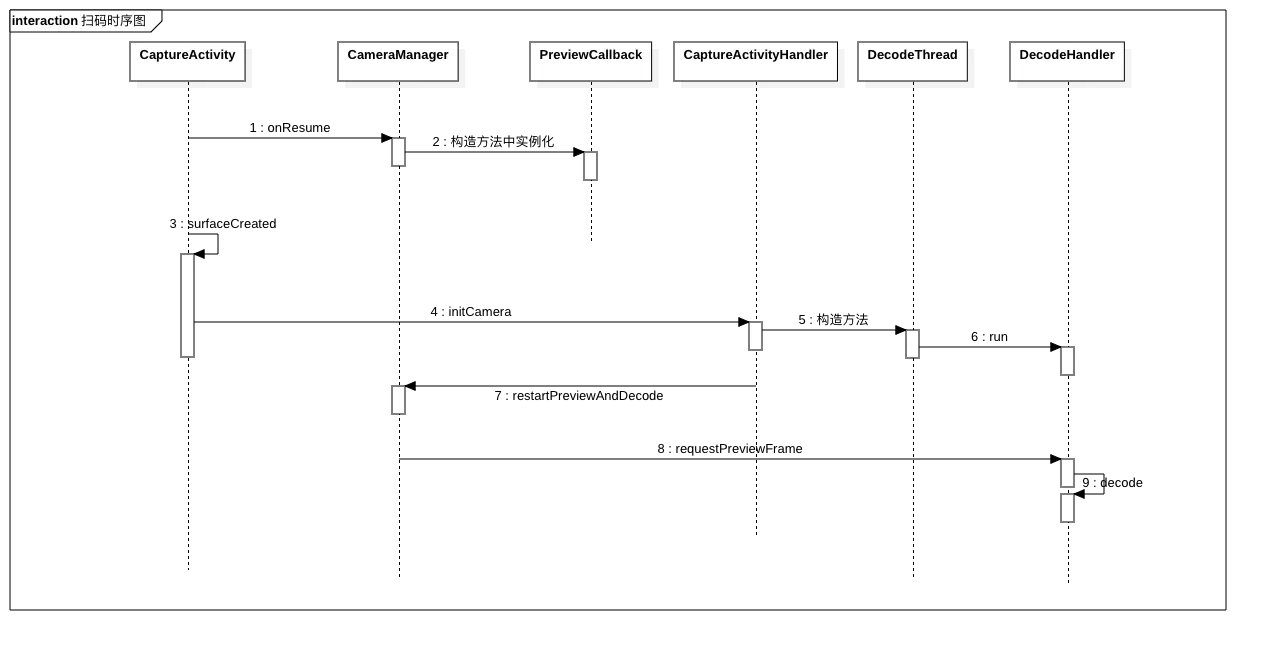 为了方便理解及记忆ZXing解码的步骤,我会边分析边画UML的序列图,最后,分析完解码的步骤,会有一个完整的序列图。现在,从主程序的入口开始分析,就是CaptureActivity的onCreate方法。