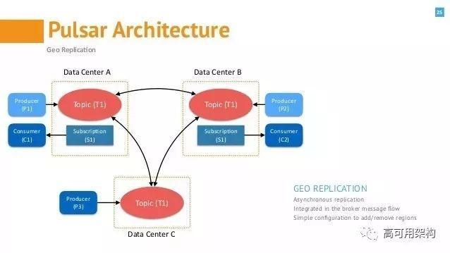 跨地域复制是Pulsar提供的解决方案。全局集群可以在名称空间级别进行配置,以便在任意数量的集群(n-wayMesh解决方案)中进行复制。从下面的示例中,数据中心C没有消费者,但数据中心A或B中仍会根据订阅模型消费消息。