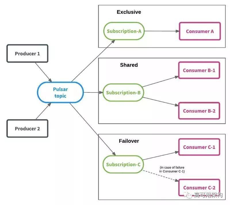 Pulsar使用同一个模型支持流和队列语义。这个特性可以通过订阅模型实现。消费者使用订阅模型中的任何一个订阅主题: