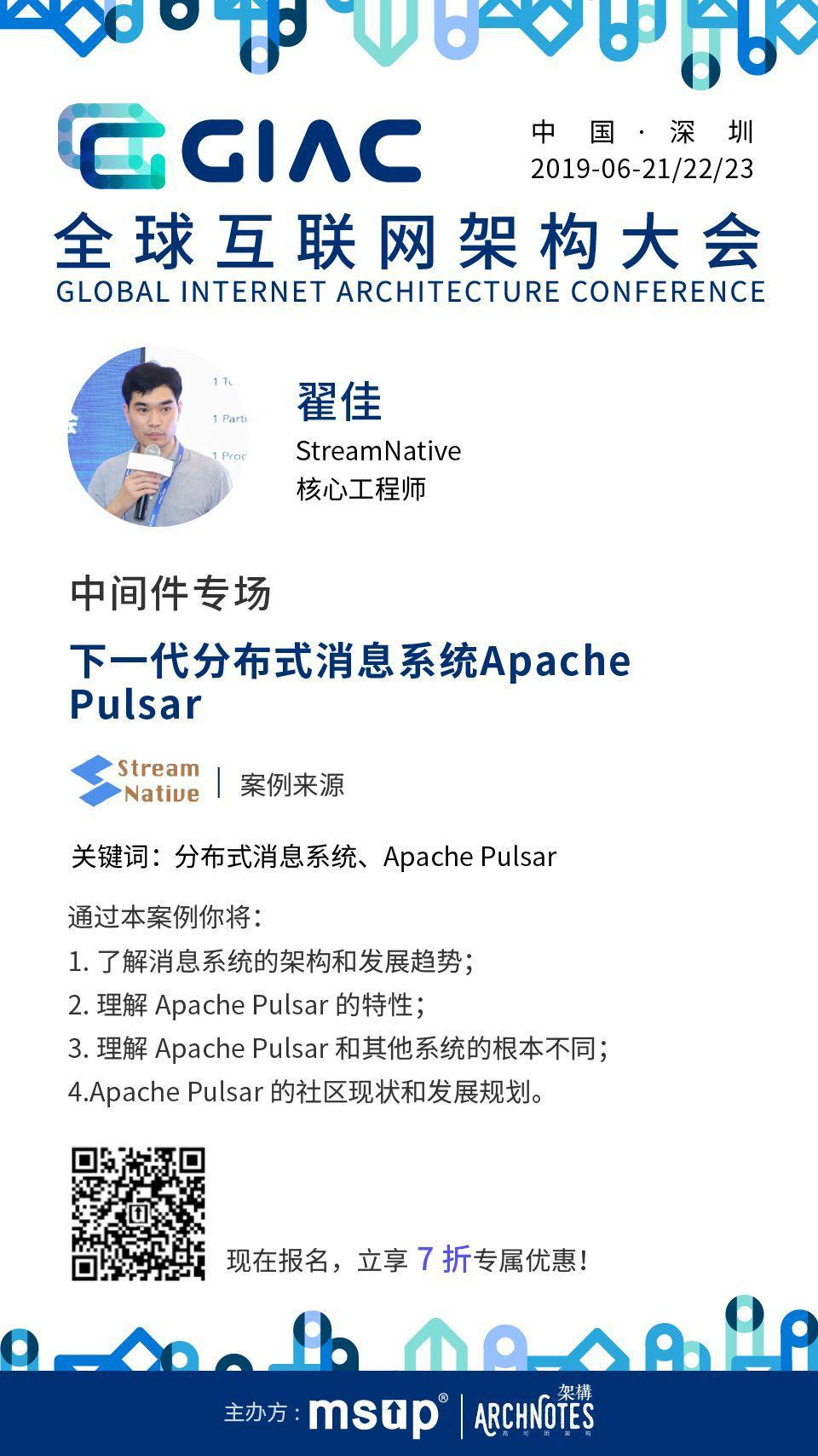 不知大家读完此文,是否被Pulsar所吸引?它确实弥补了一些竞品的短板,例如地域复制、多用户、扩展性、读写隔离等等。如果大家想了解更多关于Apache Pulsar的知识,那么就参加本月21-23日,由msup和高可用共同举办的GIAC全球互联网架构大会吧!