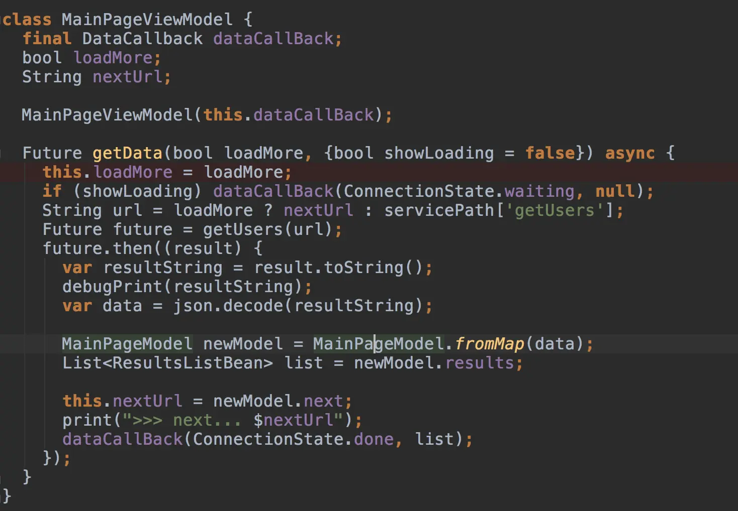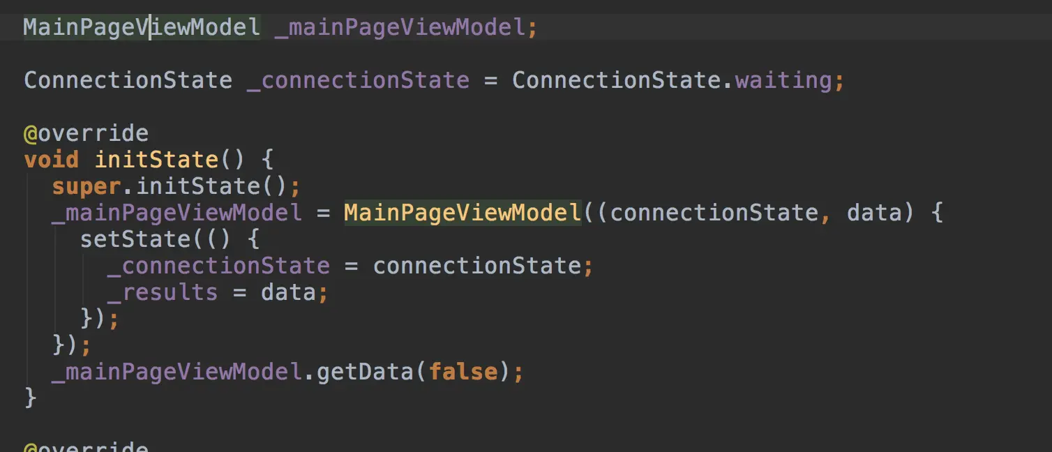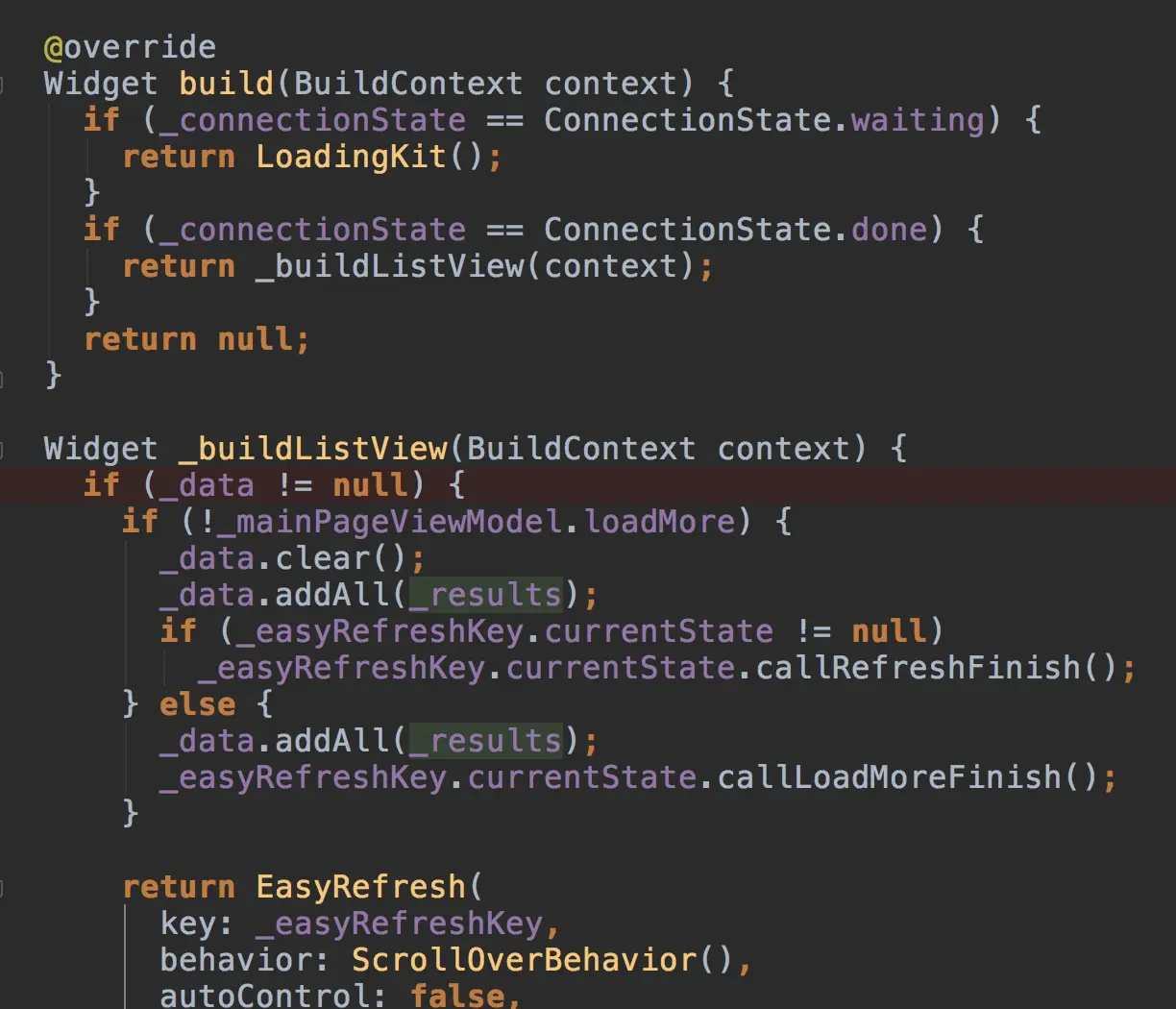 这个地方,个人觉得比较满意,在initState注册一个监听,一旦数据发送变化,会通知到这个地方,调用setState,刷新界面,之前把网络请求放到build方法中,发现build这个方法调用的太频繁了,需要维护好多种状态