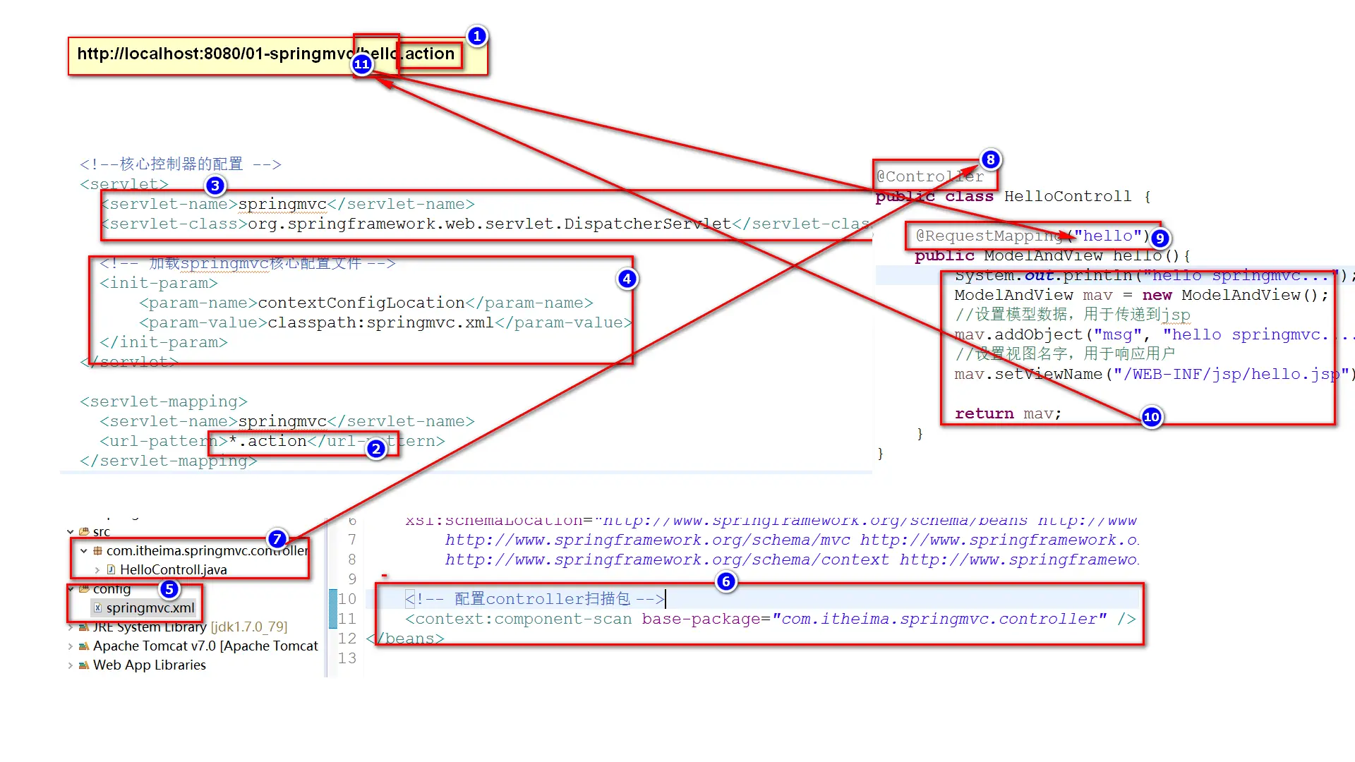 在前面我们提到DispatcherServlet的initStrategies方法会初始化9大组件,但是这里将实现一些SpringMVC的最基本的组件而不是全部,按顺序包括: