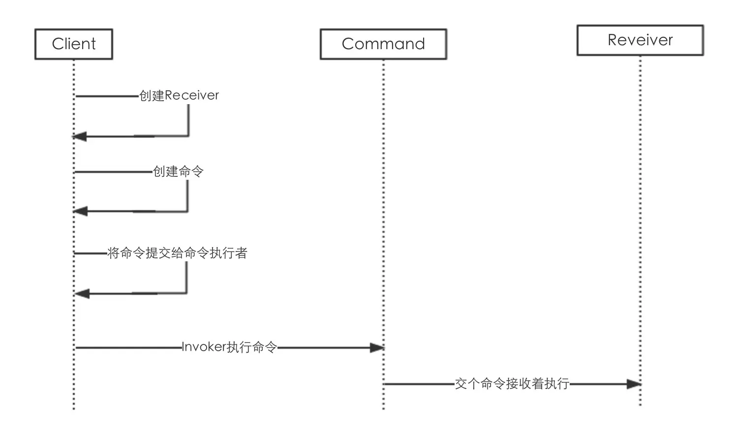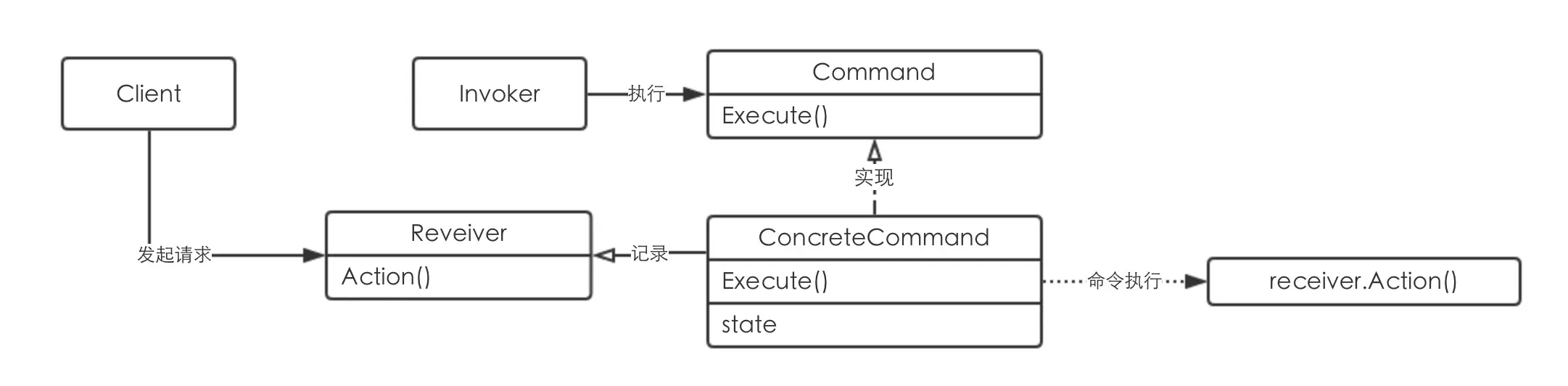 将每一个请求当做一个命令,存下具体的命令接收者,然后等待着命令被执行或者被取消,当命令被执行时,可以先记录先执行了那些命令,接着命令接收者开始执行自己的操作。
