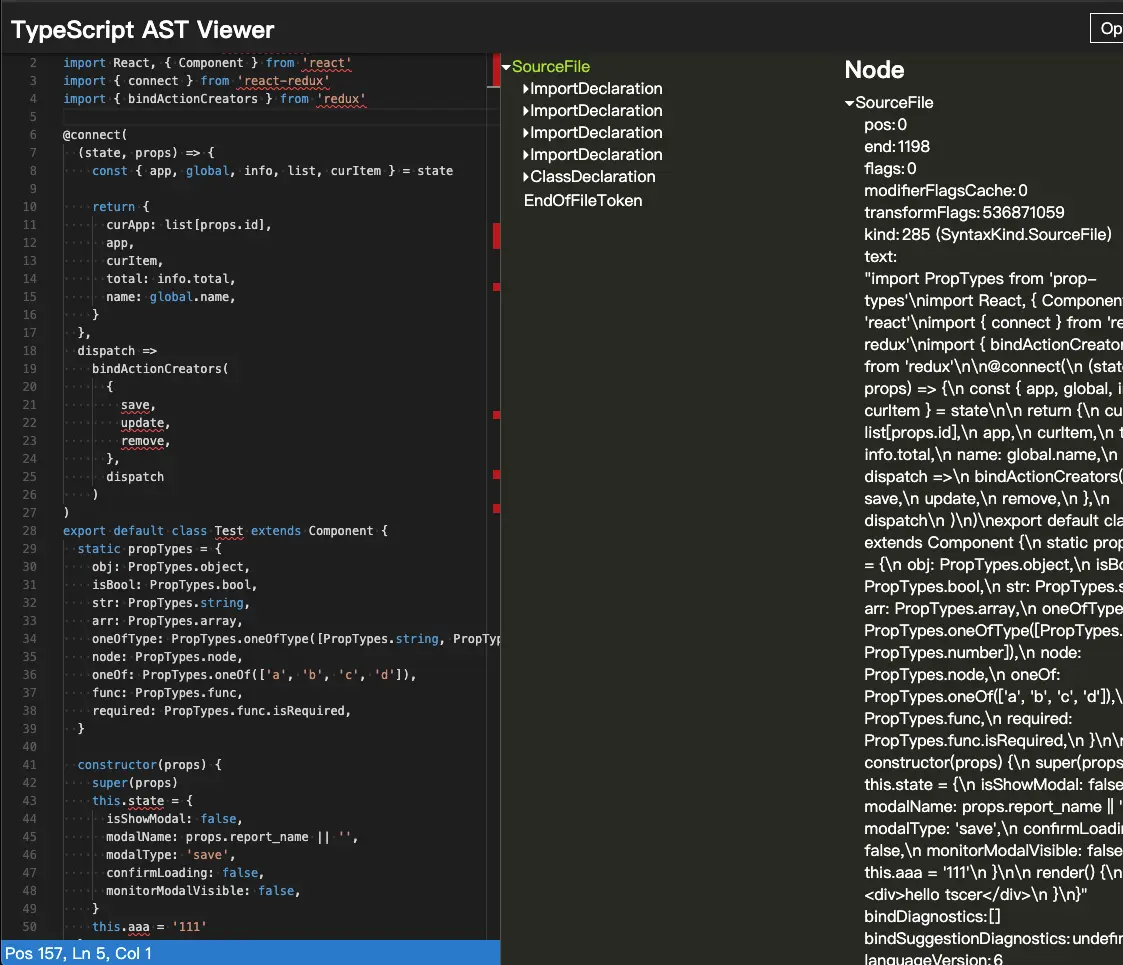 中间的SourceFile即是sourceFile的结构了,选择代码也可以看到代码对应的ast结构