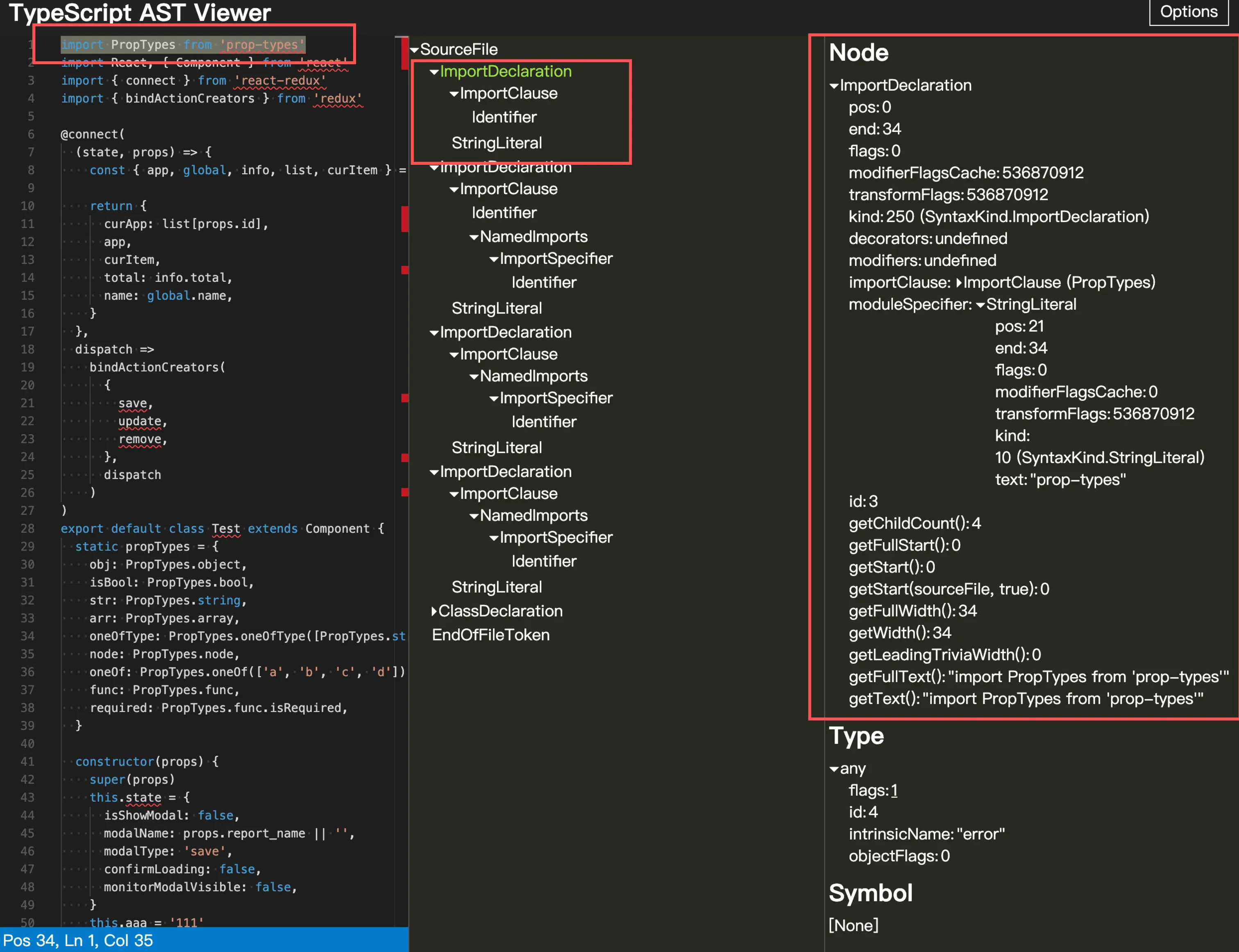 - 我们需要的是一个叫做 prop-types的import 声明,很明显在右侧它在 moduleSpecifier -> text 里面