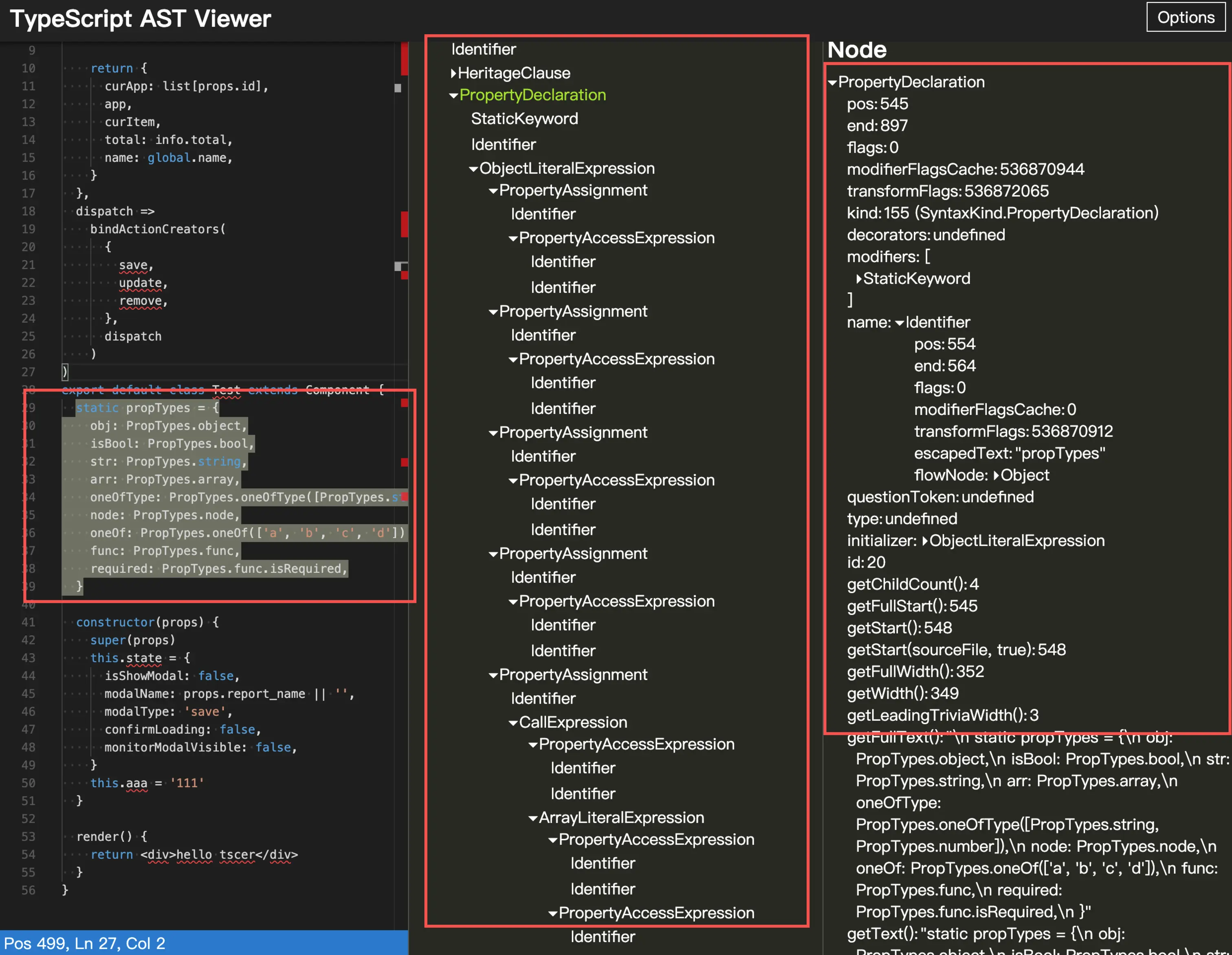- isPropertyDeclaration可以判断是否是 PropertyDeclaration,如图,PropertyDeclaration.modifiers[0] === StaticKeyword, 这里判断其修饰是否是一个 static, PropertyDeclaration.name === 'propTypes' 去判断。