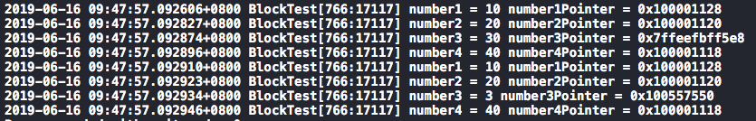 首先可以确定的是 number1和number2是没有被block捕获的,因为NSNumber是对象类型本身就是一个指针,所以number3 是被block捕获了,从前后两次打印出来的number3的数据可以看出来两个number3的地址是不同的,block内部相当于新建了一个NSNumber类型的变量来保存外部的number3,而number4 在block内部是一个双指针,也就是block内部保存了这个number4内存地址的指针,所以两个number4前后的值和地址是一样的。