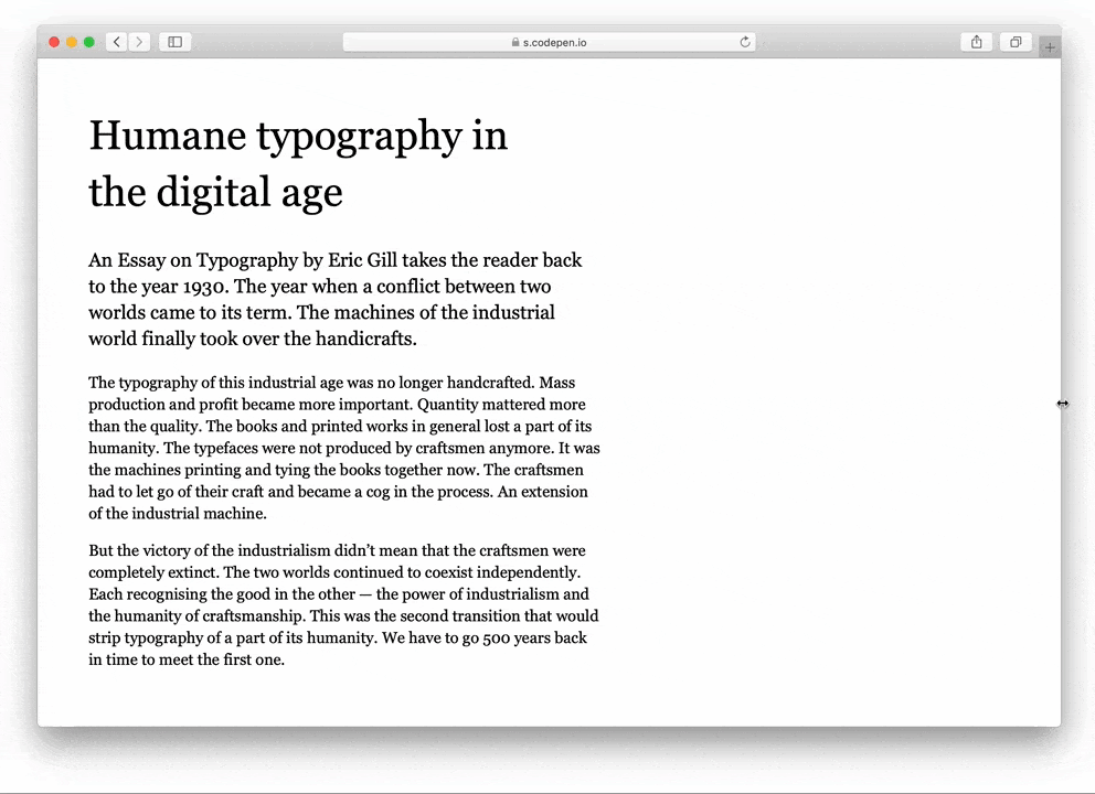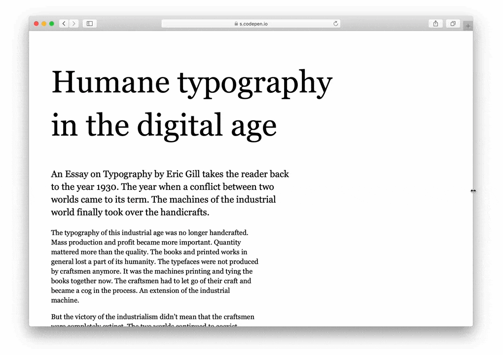 尽管如此,视窗单位长期以来一直被用作一种灵活缩放font-size的方法。@Chris Coyier早在2012年就写过相关的教程,因为我们知道每行中最理想宽宽大约是80个字符,而且“这些单位可以让你感觉完美,然后体验任何大小的屏幕”。
