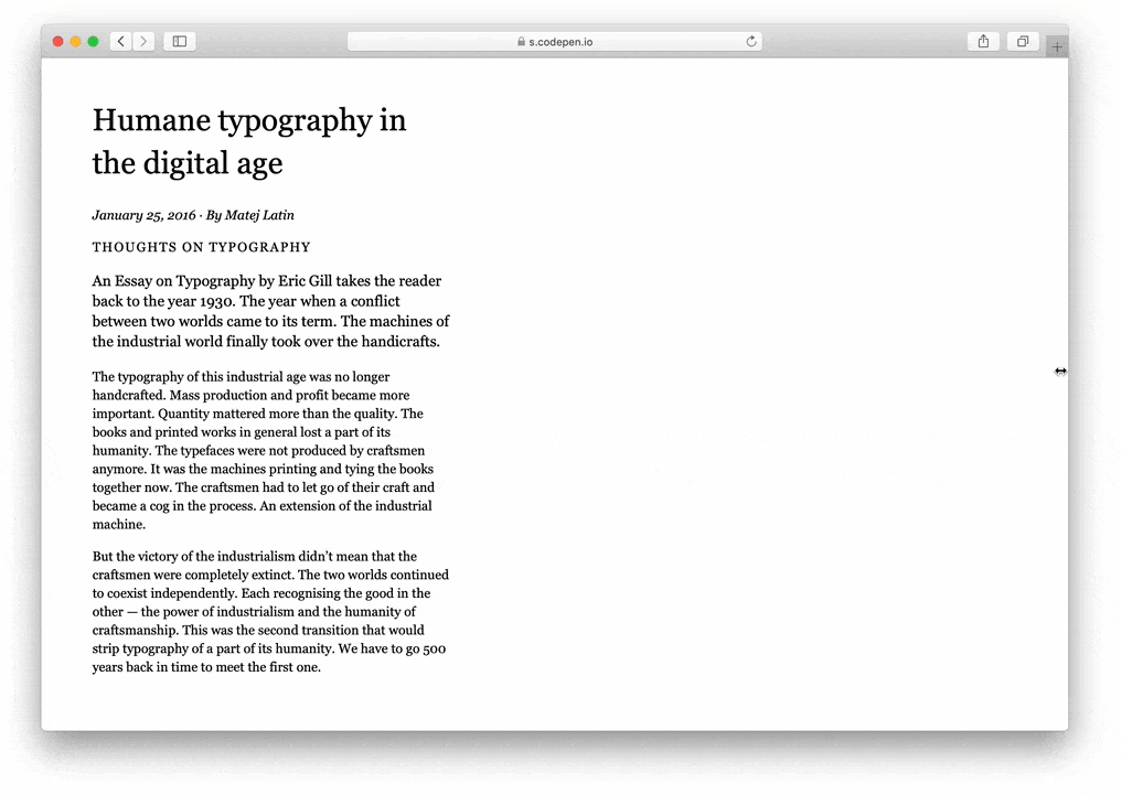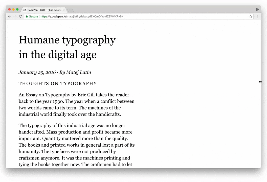 但相比于@Matej Latin在《THE STATE OF FLUID WEB TYPOGRAPHY》一文中的讨论,还是相差甚远。@Matej Latin在这篇教程中提到了多种运用于流式排版的字号设置方案。