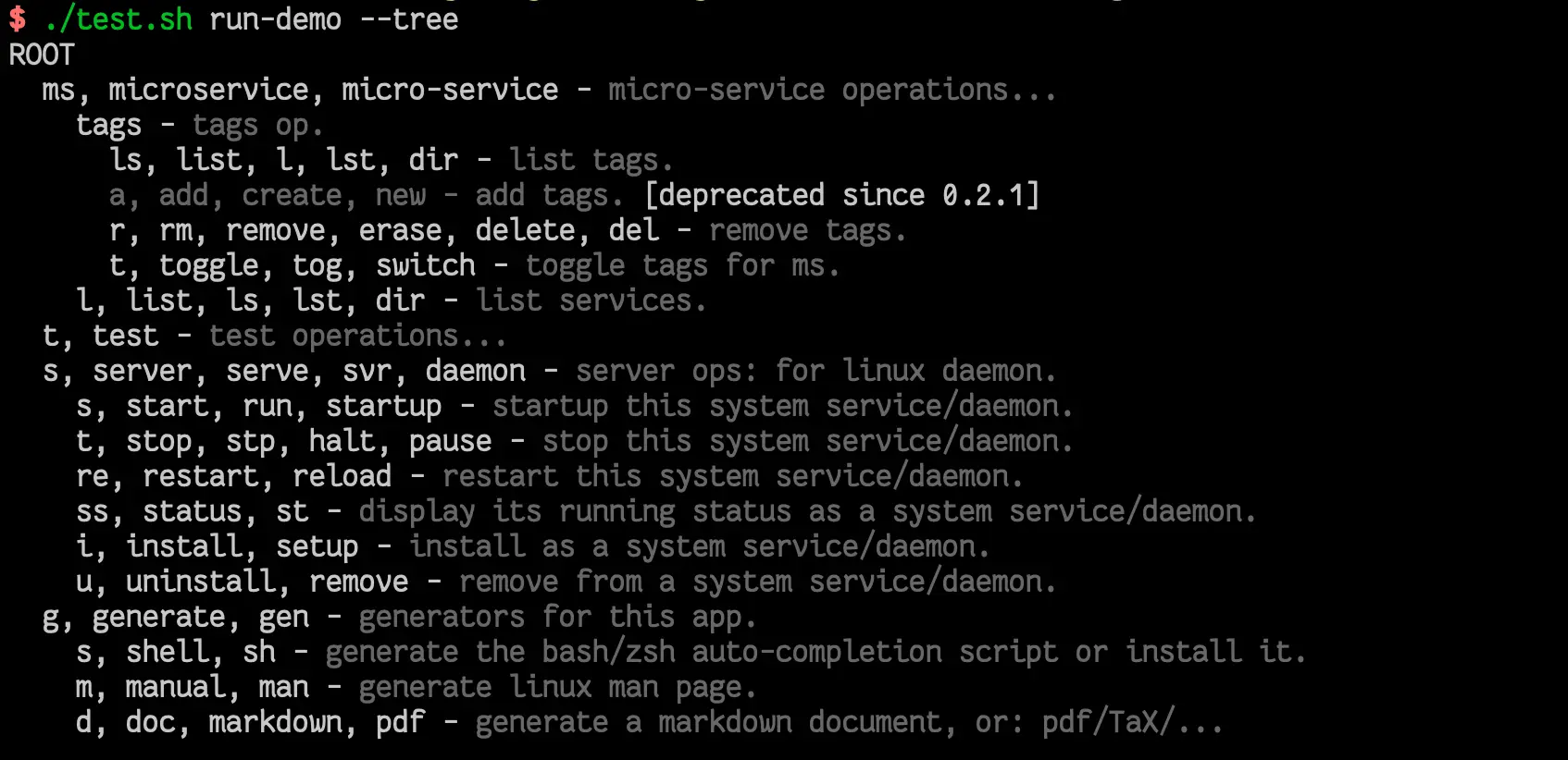 --tree 的功能是打印出全部命令和子命令,以树结构方式呈现出来。