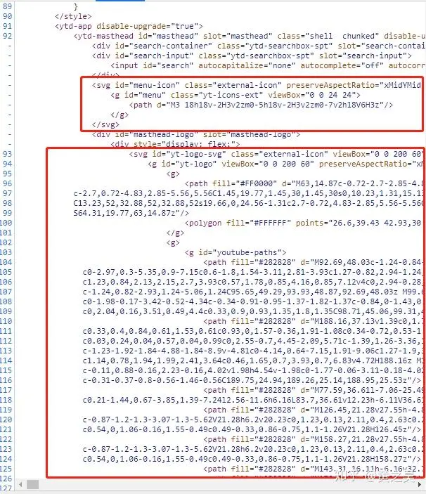 从页面源代码我们还能看到另外一点是youtube的icon全都是用svg实现的,这是和他们采取的扁平化的设计是分不开的,而内联的svg不仅仅带来了体积小、连接数少的好处,如果你仔细观察你还会看到大部分的icon都是有小动效的,这些动效是依靠svg动画实现的,比传统的gif或者序列帧动画体积可要小太多了。