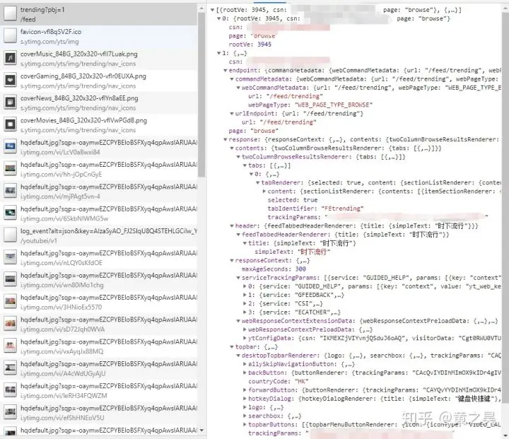 在一次页面跳转的过程:<a href = "feed/trending"> 为普通连接,点击后被network.js劫持后发出为feed/trending?pbj=1的请求