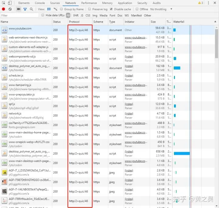 从截图可见youtube在html文档和静态资源请求上都启用了http/2 + quic/46,http/2相信还有比较多人已经开始尝试使用了,但quic在生产环境使用的并不多见。QUIC(Quick UDP Internet Connection)是google自spdy后推出的新的协议,从名字就能看到它最大的区别是使用UDP传输协议,这可以说是对http/2是一个关键的补充,因为在现实世界中我们会遇到http/2队头阻塞问题,在丢包比较严重的环境下http/2的性能是会有所下降的,而在网页这种多请求并发的情况下由于http/2的多路复用(同一个域名下共享一个tcp)的情况下http/2的整体性能甚至会比http1.1更差,而quic在解决了tcp的队头阻塞的同时实现了0RTT数据传输,连接迁移等新特性。