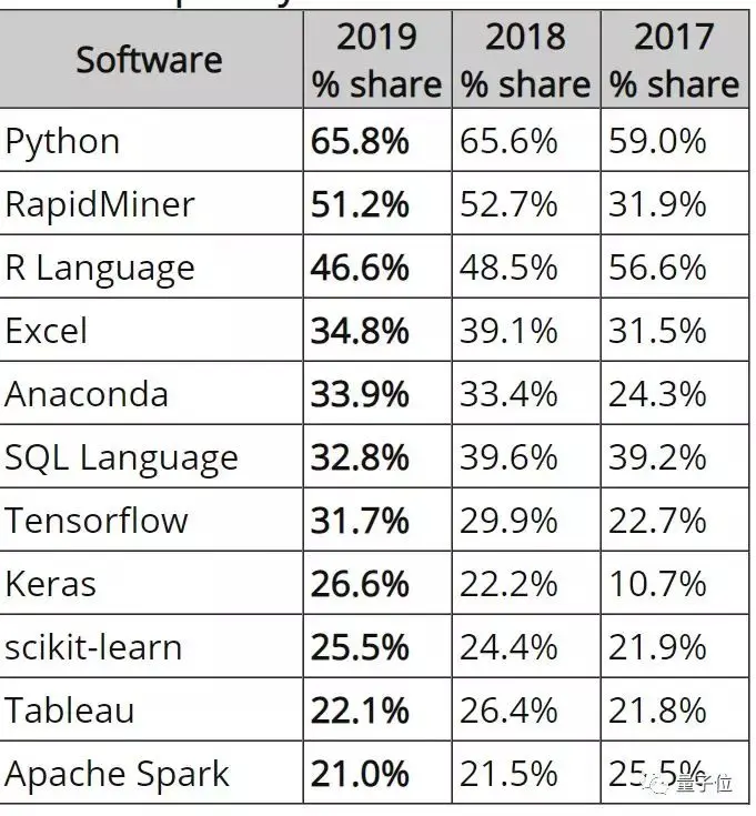 排名第二的是名为RapidMiner数据分析软件平台,使用比例为51.2%,与2018年相比,略有下降。