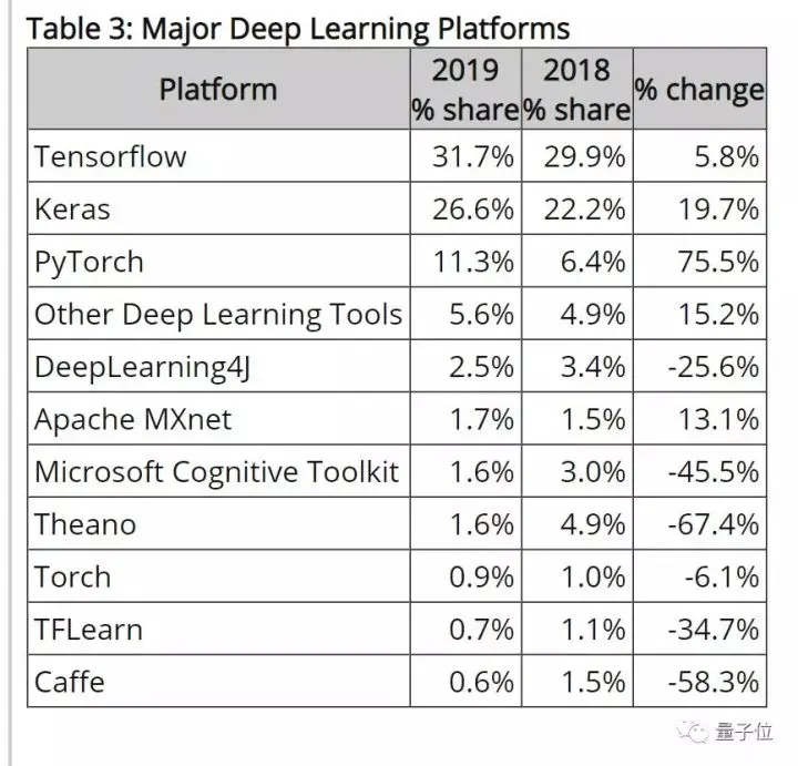 相比之下,如DeepLearning4J(-25.6%)、Caffe(-58.3%)等工具,都出现了大幅度下降。