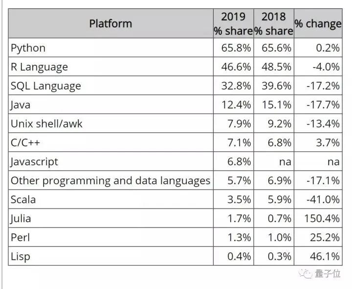 最后,只看数据分析和机器学习领域中使用到的编程语言的话,排名前五的编程语言中,除了Python有0.2%的增长,其他的几种语言,比如R语言(-4.0%)、SQL语言(-17.2%)、Java(-17.7%)、Unix shell/awk(-13.4%)等都在下降。
