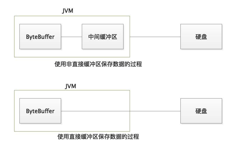 如果字节缓冲区为直接字节缓冲区,则JVM会尽量在直接字节缓冲区上执行本机I/O操作,也就是直接对内核空间进行访问,以提高运行效率.提高运行效率的原理就是在每次调用基于操作系统地I/O操作之前或之后,JVM都会尽量避免将缓冲区的内容复制到中间缓冲区中,或者从中间缓冲区中复制内容,这样就节省了一个步骤.