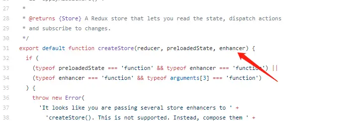 如下图,现在让我们继续深入下去,可以看到createStore这个函数接收三个参数,那么这时候我们心里肯定在想三个参数分别干嘛用的呢?我们先把它们列出来,在逐一分析每个参数的含义