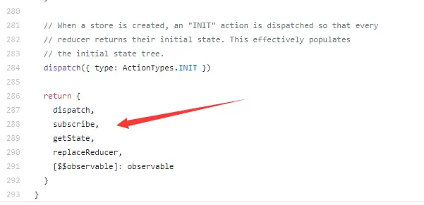 - 现在点进去看createStore.js,滑到源码最底端,可以清晰的看到createStore方法暴漏出了五个api,前面三个是我们日常项目中常用的方法,看到这里,其实我们就能想到就是执行createStore方法时,会返回一个对象,这个对象上包含这五个属性。