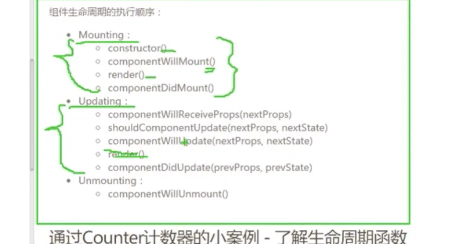 > componentDidMount: 组件完成了挂载,此时,组件已经显示到了页面上,当这个方法执行完,组件就进入都了 运行中 的状态