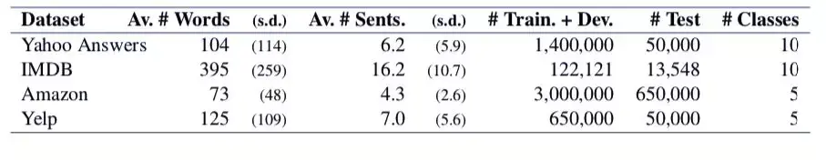 研究者探索了一个主题分类数据集(Yahoo Answers)和三个评估评级数据集(IMDB、Yelp 2017、Amazon)上的四个模型架构。每个数据集的统计数据见表 1.