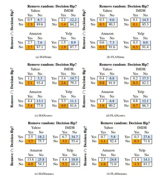 在每个排序机制和许多模型上,研究者都遇到了需要移除很大一部分神经元才能达到决策翻转目的的问题。对于 HAN 来说,这并不令人惊讶,因为这些注意力机制从更短的文本中计算注意力。对于 FLAN 来说,这种结果有些出乎意料。FLAN 经常在有几百个字符的序列上计算注意力,每个注意力的权重很可能非常小。