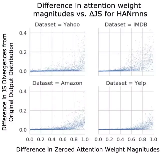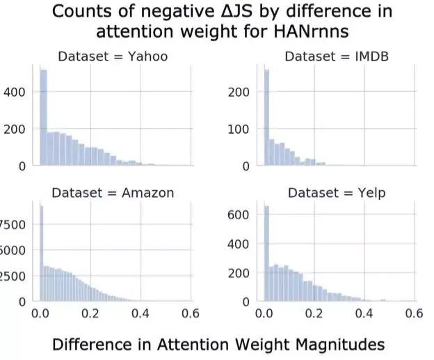然而,当开始考虑图 3 中正∆JS 值的大小时,注意力的可解释性变得更加模糊。研究者注意到,在数据集中,即使注意力权重的差异非常大,比如 0.4,许多正的∆JS 仍然非常接近于零。尽管最终发现,一旦∆α增大,∆JS 就会飙升,表明分布中只有一个非常高的注意力权重,关于 i^∗和 r 的影响究竟能有多大,这里就存在很大的争议了。