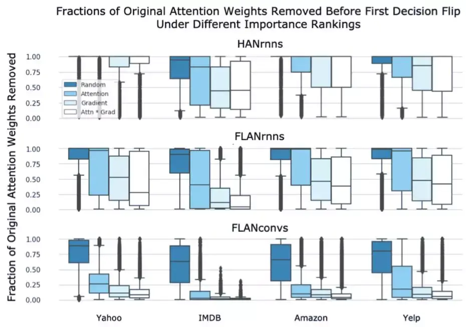 从多权重测试中,研究者发现注意力权重往往无法发现对模型最终决策发挥最重要作用的表示。甚至于,即使在基于注意力层的重要性排序翻转模型决策的速度比其他排序要快的情况下,零参与神经元的数量通常也太大,对解释(这一过程)毫无帮助。