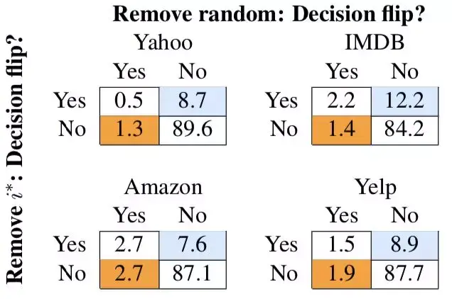 在多数情况下,擦除 i^∗不会改变模型的决策(图中的「no」列)。这可能和分布在文档中的与分类相关的信号有关(例如,Yahoo Answers 数据集中一个关于「Sports」的问题可以用几句话表示「sports」,其中任何一句都足以正确分类)。