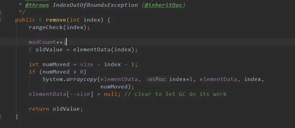 我们可以看到首先判断一下是否为空。不为空的话就开始循环查找元素,用equals来判断元素是否相同,如果一致就调用fastRemove来删除元素。然后通过System.arraycopy进行自身复制。