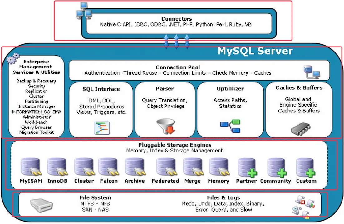 主要负责连接管理,授权认证,安全等。每个客户端连接都对应着服务器上的一个线程。服务器上维护一个线程池,避免为每个连接创建和销毁线程。当客户端连接到MySQL服务器时,服务器对其进行认证。可以通过用户名与密码认证,也可以通过SSL证书进行认证。登录认证后,服务器还会验证客户端是否有执行某个查询的操作权限。这一层并不是MySQL所特有的技术。