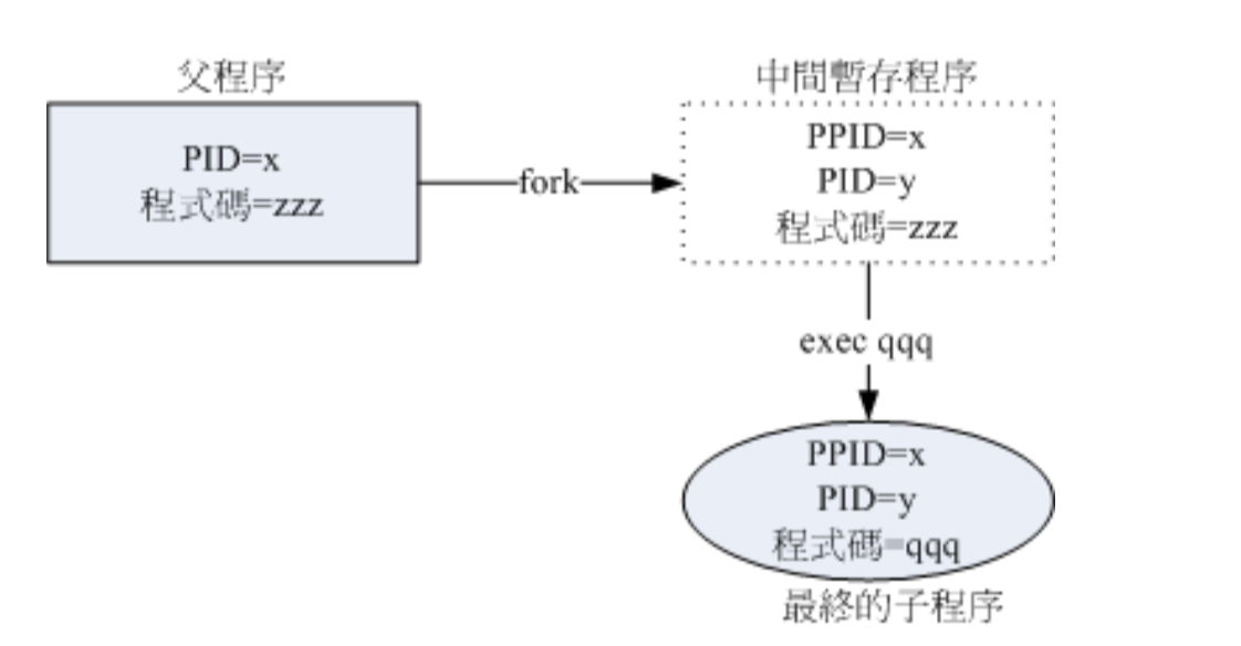 系统先以fork的方式复制一个与进程相同的暂存进程,这个进程与父进程唯一的差别就是PID不同,然后被复制出来的子进程再以exec的方式来执行实际要进行的程序,最终成为一个子进程