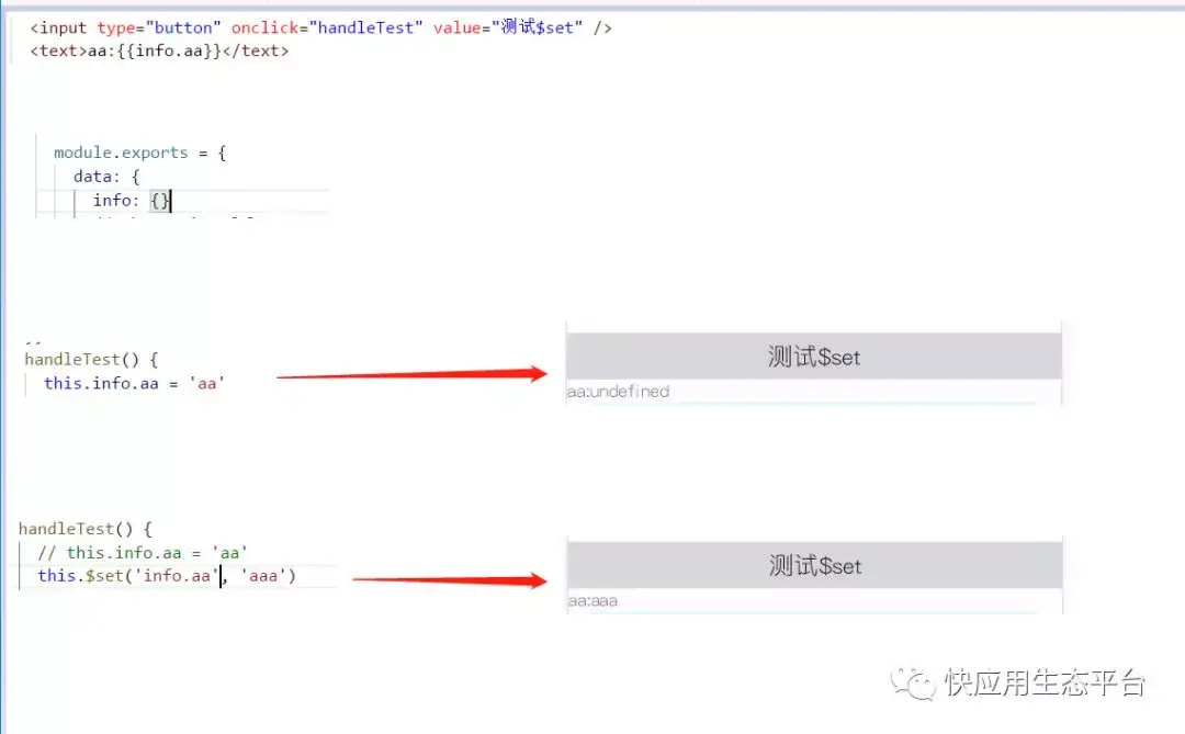 eg:在初始的data中,只设置了info为空对象,点击按钮时,设置info.aa